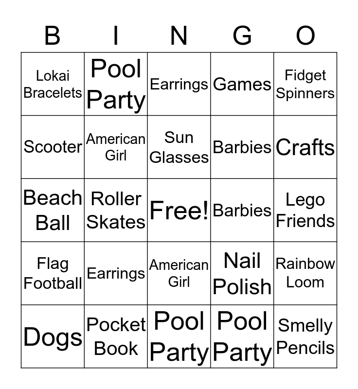 This bingo card has a free space and 24 words: Earrings, Pocket Book, Sun Glasses, Dogs, Fidget Spinners, Lokai Bracelets, Scooter, Pool Party, Barbies, American Girl, Barbies, Beach Ball, Nail Polish, Rainbow Loom, American Girl, Pool Party, Lego Friends, Earrings, Crafts, Roller Skates, Smelly Pencils, Flag Football, Games and Pool Party.
