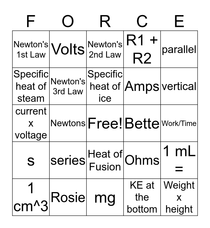 This bingo card has a free space and 30 words: Rosie, Heat of Vaporization, Newtons, 1 HP, Newton's 1st Law, Newton's 2nd Law, Newton's 3rd Law, Heat of Fusion, Bette, mg, Work/Time, Weight x height, KE at the bottom, horizontal, vertical, gravity, Ohms, s, series, parallel, current x voltage, m/s, Volts, Amps, Specific heat of steam, R1 + R2, 1 mL =, 1 cm^3, Specific heat of ice and Specific heat of water.