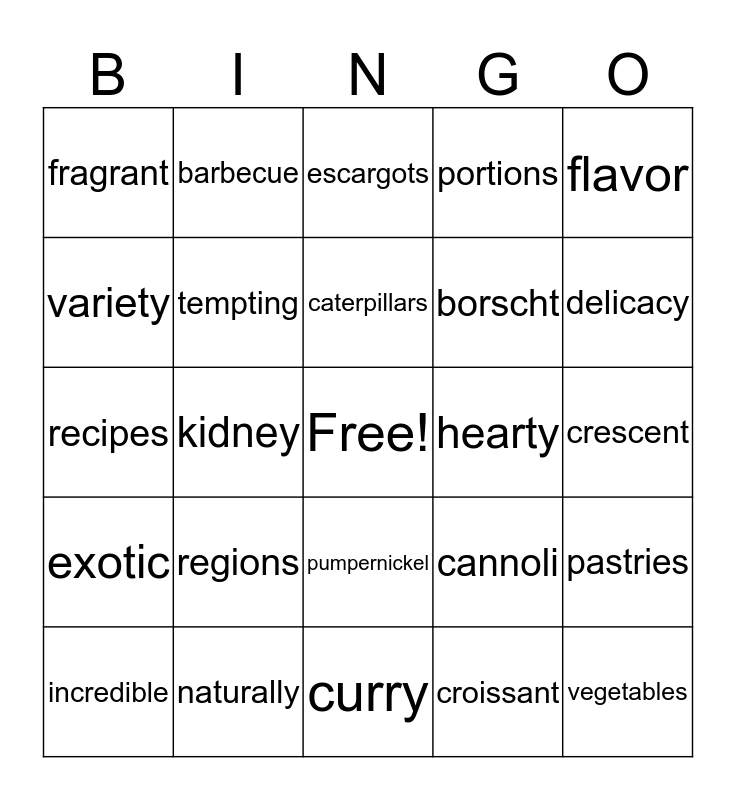 This bingo card has a free space and 24 words: regions, naturally, caterpillars, incredible, flavor, fragrant, variety, barbecue, hearty, pumpernickel, borscht, recipes, cannoli, pastries, tempting, croissant, crescent, escargots, delicacy, kidney, vegetables, exotic, portions and curry.