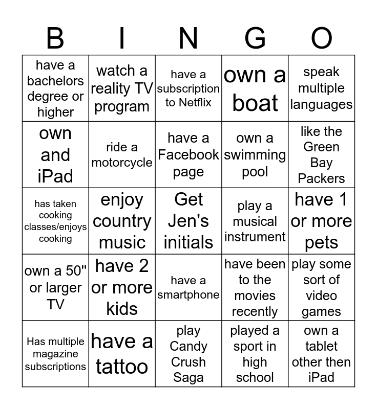 This bingo card has a free space and 24 words: have 2 or more kids, have a tattoo, have a Facebook page, Has multiple magazine subscriptions, speak multiple languages, have a bachelors degree or higher, own and iPad, watch a reality TV program, play a musical instrument, have a smartphone, own a swimming pool, has taken cooking classes/enjoys cooking, have been to the movies recently, play some sort of video games, ride a motorcycle, played a sport in high school, have 1 or more pets, have a subscription to Netflix, like the Green Bay Packers, enjoy country music, own a tablet other then iPad, own a 50'' or larger TV, own a boat and play Candy Crush Saga.