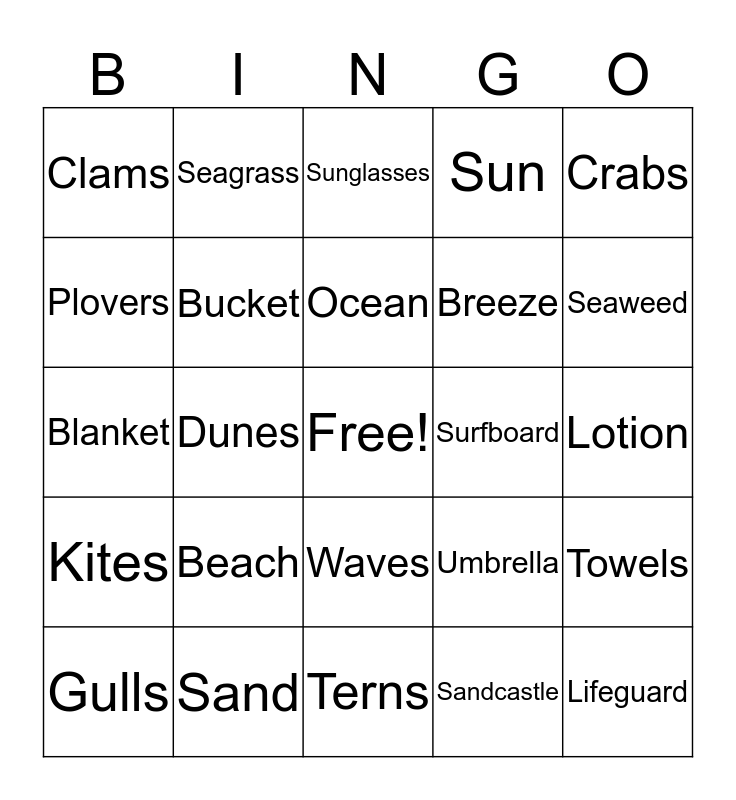 This bingo card has a free space and 24 words: Beach, Sand, Ocean, Gulls, Crabs, Clams, Plovers, Seagrass, Surfboard, Waves, Breeze, Blanket, Umbrella, Towels, Bucket, Sandcastle, Lotion, Sunglasses, Seaweed, Dunes, Lifeguard, Kites, Sun and Terns.