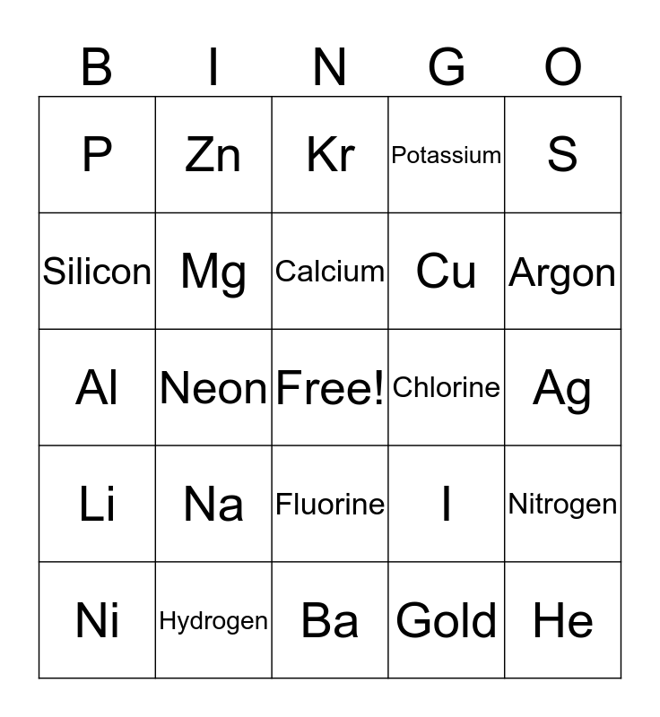 This bingo card has a free space and 24 words: Na, Hydrogen, Calcium, Ni, S, P, Silicon, Zn, Chlorine, Fluorine, Cu, Al, I, Nitrogen, Mg, Gold, Ag, Kr, Argon, Neon, He, Li, Potassium and Ba.