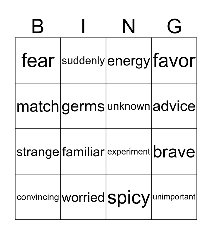 This bingo card has 111 words: over, under, through, stumble, gloomy, manners, respect, attention, shelter, borrow, run smoothly, gather, expect, kind, sturdy, blue, fine print, healthy, unhealthy, exercise, protect, energy, habit, recently, important, unimportant, impolite, coincidence, calm, emotions, fear, brave, terrified, allowed, report, bully, forgive, invisible, caring, invite, ignore, full, empty, pout, advice, agree, hope destined, elegant, clumsy, useful, useless, lovely, miracle, brag, independent, judge, germs, announce, jealous, extra, remarkable, possible, impossible, curse, relative, strange, travel, wrinkled, dream, unknown, familiar, unfamiliar, advantage, disadvantage, routine, shortcut, decide, on schedule, steep, tussle, arrangements, exchange, worried, realize, return, extinct, favor, protest, convincing, shocked, match, mismatch, subject, boring, unique, bilingual, experiment, stick, container, soak, shape, proud, disappointed, frustrated, mighty, suddenly, key, conversation, mild, spicy and host.
