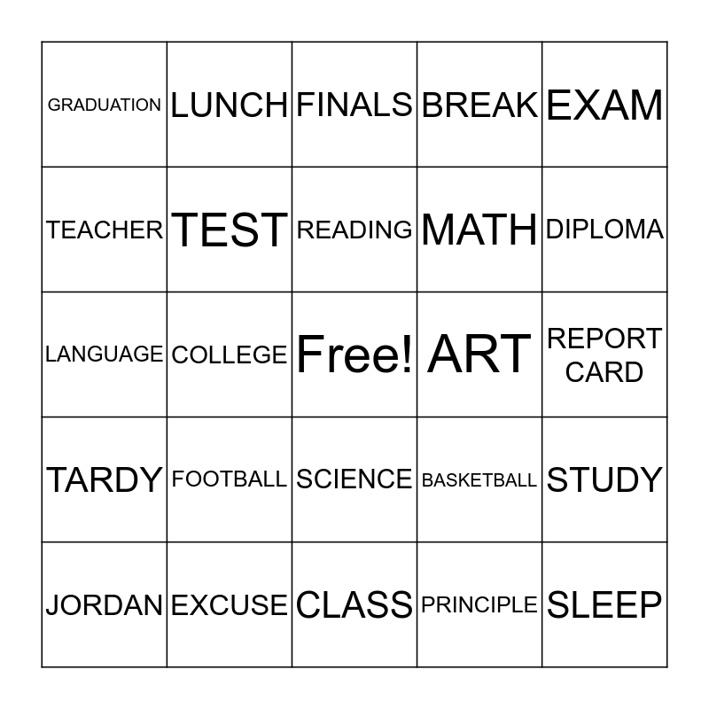 This bingo card has a free space and 25 words: FOOTBALL, CLASS, READING, JORDAN, EXAM, GRADUATION, TEACHER, LUNCH, ART, SCIENCE, MATH, LANGUAGE, BASKETBALL, STUDY, TEST, BELL, REPORT CARD, FINALS, DIPLOMA, COLLEGE, SLEEP, EXCUSE, TARDY, BREAK and PRINCIPLE.