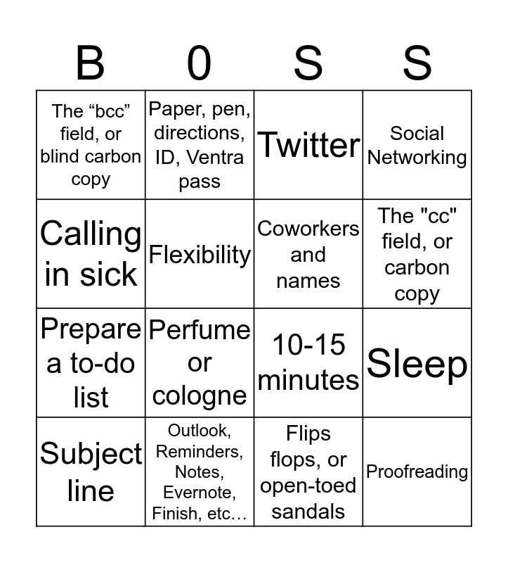 This bingo card has 19 words: 10-15 minutes, Never, Twitter, Proofreading, Sleep, Calling in sick, Flips flops, or open-toed sandals, The “bcc” field, or blind carbon copy, Paper, pen, directions, ID, Ventra pass, Prepare a to-do list, Perfume or cologne, Flexibility, Coworkers and names, Outlook, Reminders, Notes, Evernote, Finish, etc…, Subject line, Reference letter, Social Networking, The "cc" field, or carbon copy and Sunglasses.