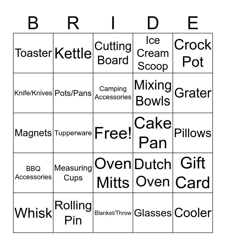 This bingo card has a free space and 35 words: Sheets, Water Bottle, Popcorn Popper, Pots/Pans, Oven Mitts, Ice Cream Scoop, Knife/Knives, Tortilla Press, Camping Accessories, Mugs, Magnets, Crock Pot, Cookie Sheet, Kitchen Towels, Toaster, Cake Pan, Glasses, Tupperware, BBQ Accessories, Cooler, Dutch Oven, Whisk, Gift Card, Rolling Pin, Cutting Board, Grater, Bath Towels, Spatula, Mixing Bowls, Pillows, Picture Frames, Blanket/Throw, Measuring Cups, Kettle and Muffin Pan.