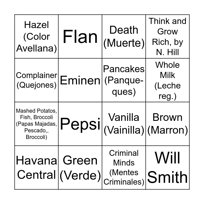 This bingo card has 16 words: Green (Verde), Brown (Marron), Death (Muerte), Hazel (Color Avellana), Mashed Potatos, Fish, Broccoli (Papas Majadas, Pescado,, Broccoli), Flan, Vanilla (Vainilla), Criminal Minds (Mentes Criminales), Complainer (Quejones), Eminen, Havana Central, Think and Grow Rich, by N. Hill, Pepsi, Whole Milk (Leche reg.), Pancakes (Panque-ques) and Will Smith.