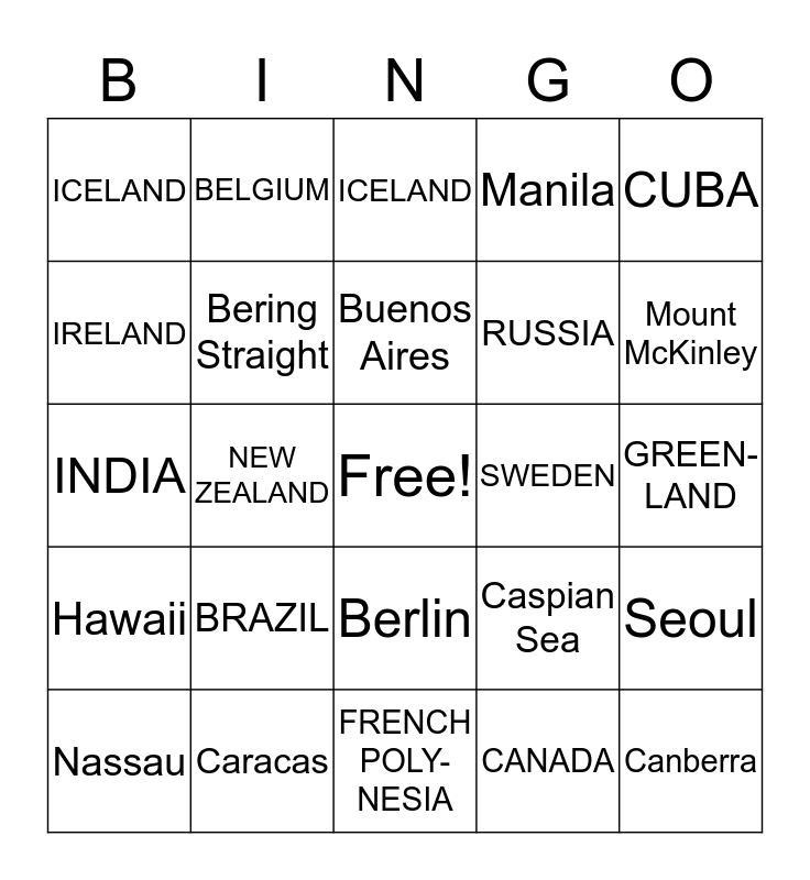 This bingo card has a free space and 24 words: BRAZIL, Caracas, Buenos Aires, Nassau, CUBA, ICELAND, IRELAND, BELGIUM, SWEDEN, Berlin, RUSSIA, INDIA, Caspian Sea, Seoul, Bering Straight, CANADA, GREEN- LAND, ICELAND, Mount McKinley, NEW ZEALAND, Canberra, Hawaii, Manila and FRENCH POLY- NESIA.