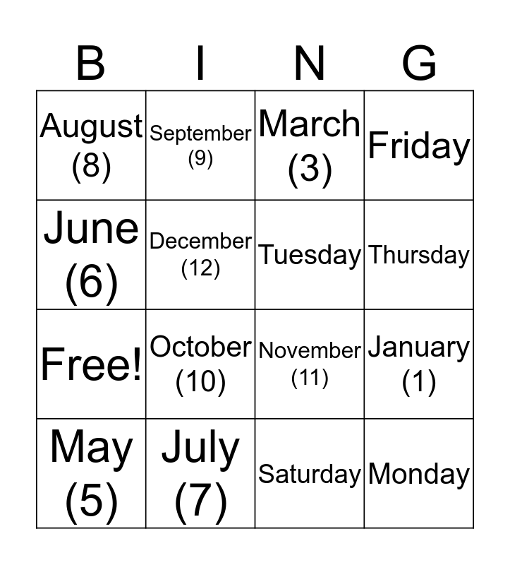 This bingo card has 20 words: January (1), February (2), March (3), April (4), May (5), June (6), July (7), August (8), Free!, September (9), October (10), November (11), December (12), Monday, Tuesday, Wednesday, Thursday, Friday, Saturday and Sunday.
