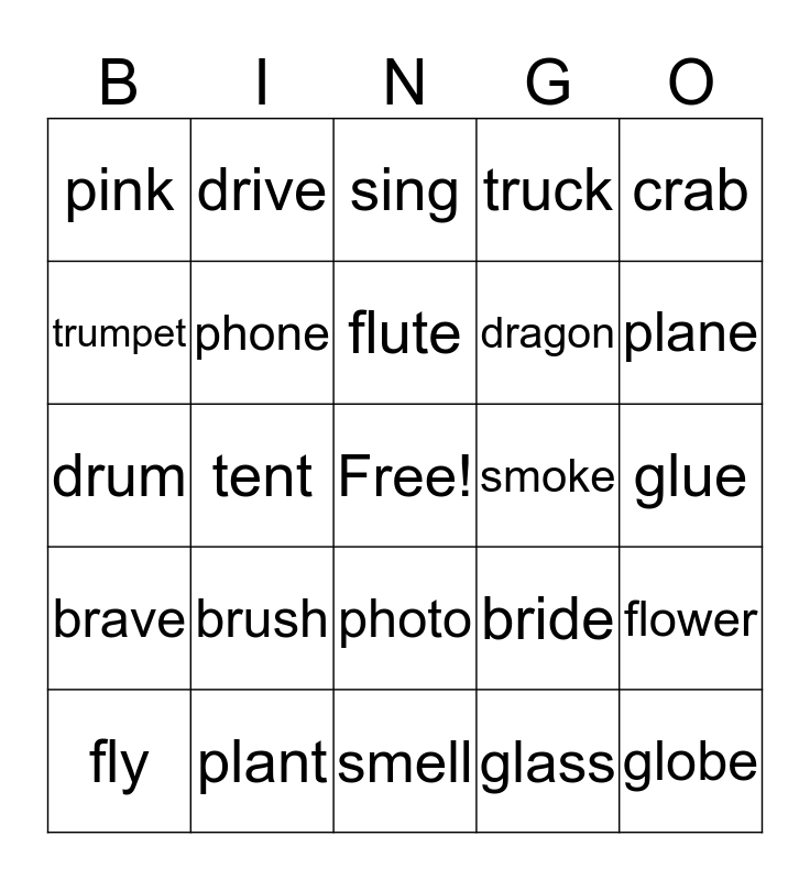 This bingo card has a free space and 30 words: plant, ant, tent, ink, pink, sing, phone, photo, smoke, smell, glue, globe, glass, plum, plane, brown, bride, brave, brush, crab, drum, dress, drive, dragon, trumpet, truck, flower, fly, flute and flag.