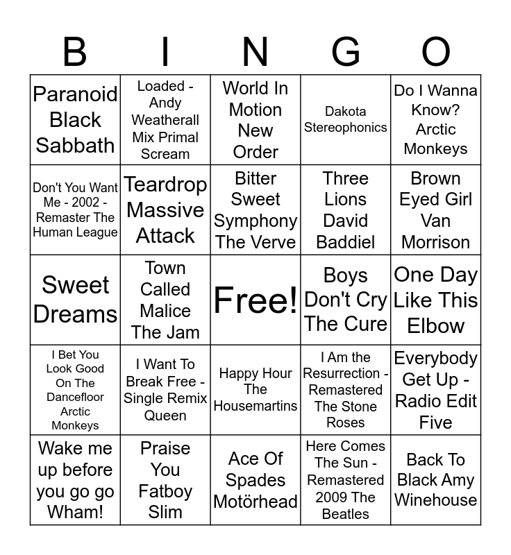 This bingo card has a free space and 73 words: The Universal Blur, Let's Dance - 1999 Remastered Version David Bowie, Paranoid Black Sabbath, Biology Girls Aloud, Rehab Amy Winehouse, We Are The Champions Queen, I Bet You Look Good On The Dancefloor Arctic Monkeys, Blue Monday New Order, I Am the Resurrection - Remastered The Stone Roses, Love Will Tear Us Apart Joy Division, Block Rockin' Beats - 2003 Digital Remaster The Chemical Brothers, Step On Happy Mondays, Teardrop Massive Attack, One Day Like This Elbow, The A Team Ed Sheeran, Loaded - Andy Weatherall Mix Primal Scream, Ace Of Spades Motörhead, Don't You Want Me - 2002 - Remaster The Human League, Club Foot Kasabian, Boys Don't Cry The Cure, Bitter Sweet Symphony The Verve, Dakota Stereophonics, Do I Wanna Know? Arctic Monkeys, Don't Look Back In Anger Oasis, Wake me up before you go go Wham!, London Calling - Remastered The Clash, I Believe In A Thing Called Love The Darkness, Wonderwall Oasis, This Is How It Feels Inspiral Carpets, Born Slippy, Praise You Fatboy Slim, Hey Boy Hey Girl The Chemical Brothers, House Of Fun Madness, Unbelievable EMF, Town Called Malice The Jam, Yellow Coldplay, Should I Stay or Should I Go The Clash, Unfinished Sympathy - 2012 Mix/Master Massive Attack, Back To Black Amy Winehouse, Hello Adele, Here Comes The Sun - Remastered 2009 The Beatles, I Want To Break Free - Single Remix Queen, There Is A Light That Never Goes Out - 2011 R… The Smiths, DARE Gorillaz, (I can't get no) Satisfaction - The Rolling Stones, Three Lions David Baddiel, World In Motion New Order, Soul Limbo - BBC Cricket Theme Various Artists, How Long Will I Love You - Bonus Track Ellie Goulding, Sweet Dreams, You've Got The Love Florence + The Machine, Goldfinger - 2011 Remastered Version Ash, Tiny Dancer Elton John, Patience Take That, Don't You Want Me - 2002 - Remaster The Human League, History One Direction, My Generation - Original Mono Version The Who, Happy Hour The Housemartins, Nobody To Love - Radio Edit Sigma, Figure It Out Royal Blood, Black Magic Little Mix, Relax Frankie Goes To Hollywood, How Deep Is Your Love Calvin Harris, Brown Eyed Girl Van Morrison, Ain’t No Pleasing You Chas & Dave, Let's Get Ready to Rumble, You Can't Hurry Love - 2016 Remastered Phil Collins, Pure Shores All Saints, Everybody Get Up - Radio Edit Five, She Said Plan B, Fill Me In Craig David, Juxtapozed With U Super Furry Animals and 2 become 1 Spice Girls.