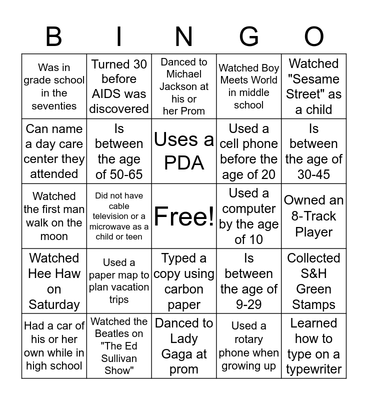 This bingo card has a free space and 24 words: Used a paper map to plan vacation trips, Watched the Beatles on "The Ed Sullivan Show", Uses a PDA, Had a car of his or her own while in high school, Watched "Sesame Street" as a child, Was in grade school in the seventies, Can name a day care center they attended, Turned 30 before AIDS was discovered, Used a computer by the age of 10, Typed a copy using carbon paper, Used a cell phone before the age of 20, Watched the first man walk on the moon, Is between the age of 9-29, Collected S&H Green Stamps, Is between the age of 50‐65, Used a rotary phone when growing up, Owned an 8‐Track Player, Danced to Michael Jackson at his or her Prom, Is between the age of 30-45, Did not have cable television or a microwave as a child or teen, Learned how to type on a typewriter, Watched Hee Haw on Saturday, Watched Boy Meets World in middle school and Danced to Lady Gaga at prom.