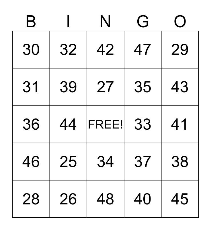 This bingo card has a free space and 24 words: 25, 26, 27, 28, 29, 30, 31, 32, 33, 34, 35, 36, 37, 38, 39, 40, 41, 42, 43, 44, 45, 46, 47 and 48.