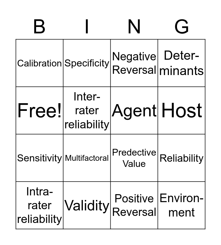 This bingo card has 16 words: Validity, Reliability, Negative Reversal, Calibration, Sensitivity, Specificity, Predective Value, Positive Reversal, Free!, Inter-rater reliability, Intra-rater reliability, Deter-minants, Multifactoral, Host, Agent and Environ-ment.