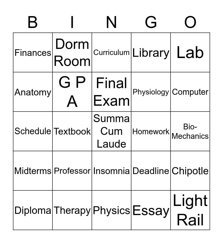 This bingo card has a free space and 24 words: Professor, Therapy, Final Exam, Diploma, Lab, Finances, Anatomy, Dorm Room, Homework, Insomnia, Physiology, Schedule, Deadline, Chipotle, G P A, Essay, Bio- Mechanics, Curriculum, Computer, Textbook, Light Rail, Midterms, Library and Physics.