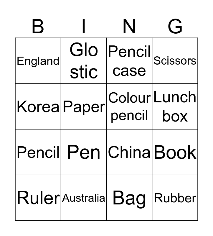 This bingo card has 16 words: Australia, Book, Pencil case, England, Pencil, Glo stic, China, Bag, Korea, Paper, Ruler, Scissors, Pen, Lunch box, Colour pencil and Rubber.