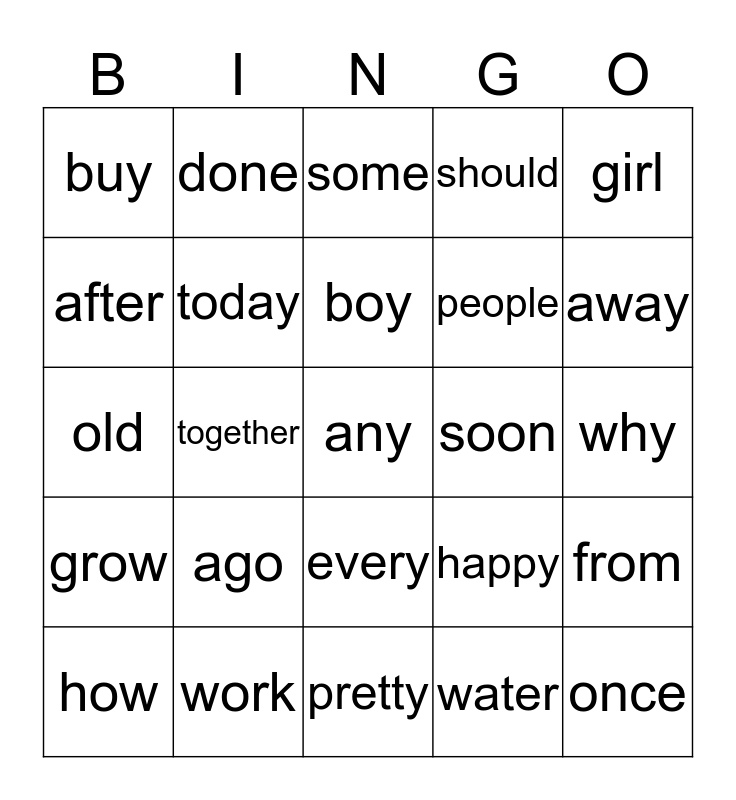 This bingo card has a free space and 24 words: ago, work, boy, how, girl, buy, after, done, soon, every, people, old, happy, from, today, water, why, some, away, together, once, grow, should and pretty.