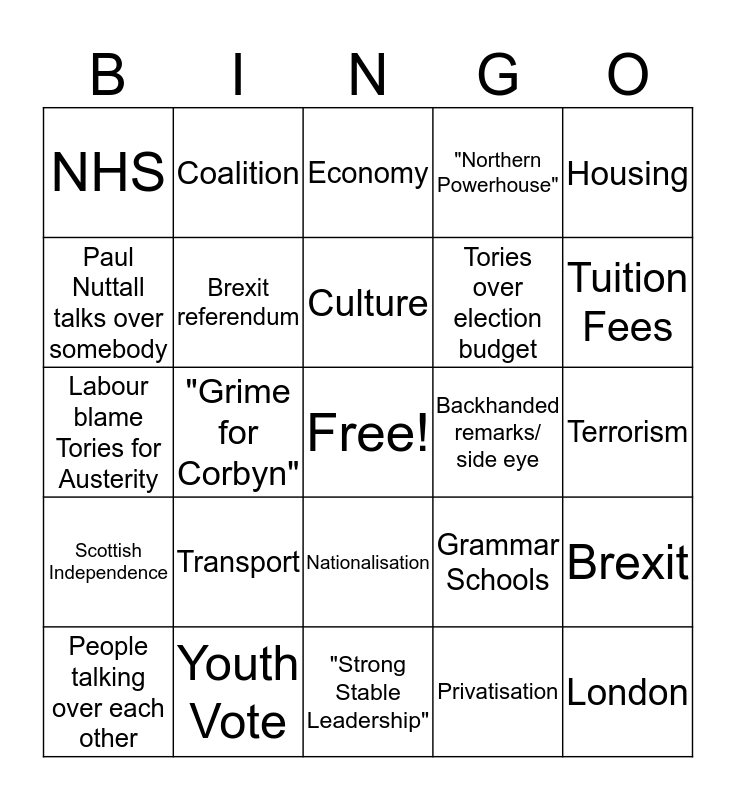 This bingo card has a free space and 24 words: Transport, Youth Vote, Culture, People talking over each other, Housing, NHS, Paul Nuttall talks over somebody, Coalition, Backhanded remarks/ side eye, Nationalisation, Tories over election budget, Labour blame Tories for Austerity, Grammar Schools, Brexit, Brexit referendum, Privatisation, Terrorism, Economy, Tuition Fees, "Grime for Corbyn", London, Scottish Independence, "Northern Powerhouse" and "Strong Stable Leadership".