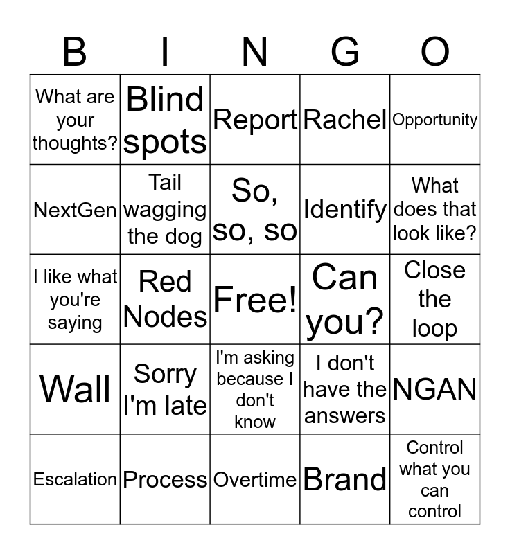 This bingo card has a free space and 24 words: Sorry I'm late, Process, So, so, so, Escalation, Opportunity, What are your thoughts?, NextGen, Blind spots, Can you?, I'm asking because I don't know, Identify, I like what you're saying, I don't have the answers, NGAN, Tail wagging the dog, Brand, Close the loop, Report, What does that look like?, Red Nodes, Control what you can control, Wall, Rachel and Overtime.