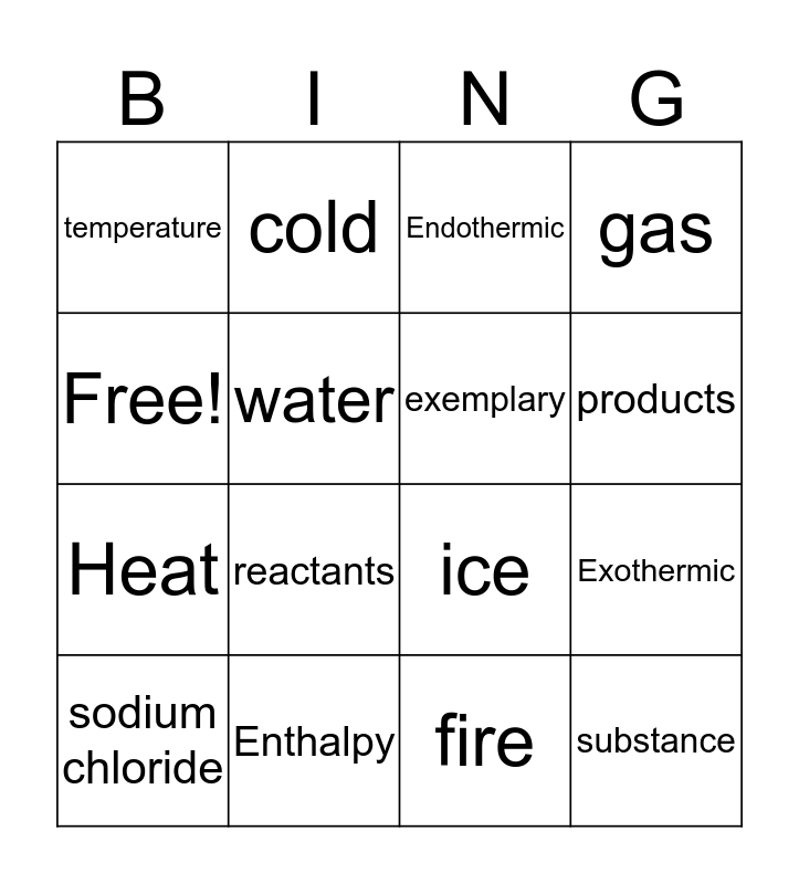 This bingo card has 16 words: Enthalpy, Exothermic, Endothermic, temperature, Heat, cold, ice, fire, Free!, water, sodium chloride, gas, reactants, products, exemplary and substance.
