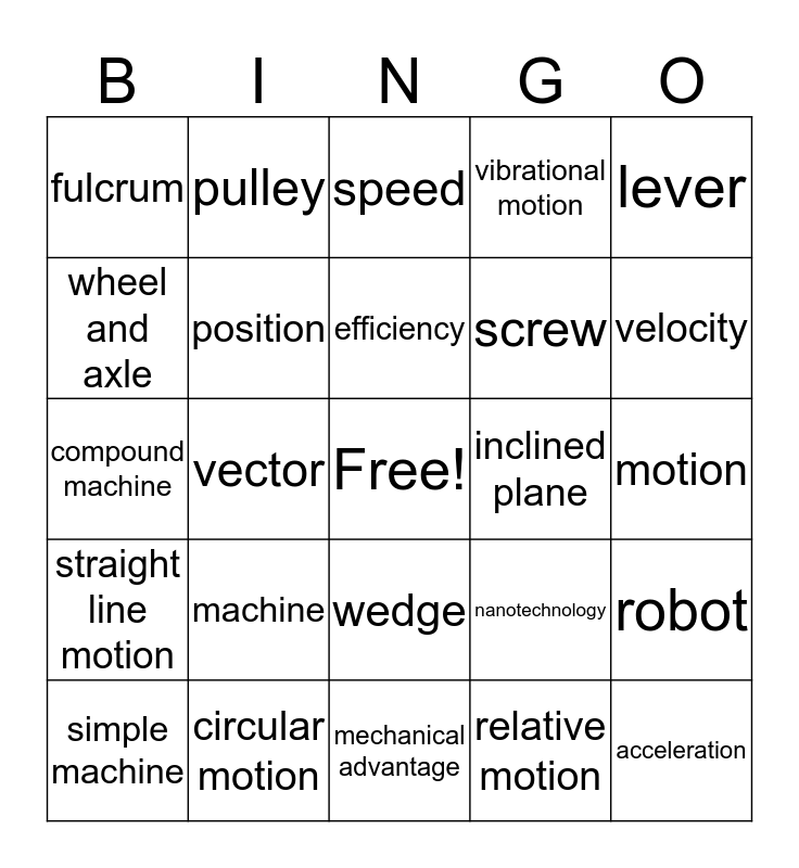 This bingo card has a free space and 25 words: machine, mechanical advantage, efficiency, simple machine, lever, fulcrum, wheel and axle, pulley, inclined plane, wedge, screw, compound machine, nanotechnology, robot, position, reference point, motion, speed, velocity, vector, acceleration, circular motion, straight line motion, vibrational motion and relative motion.