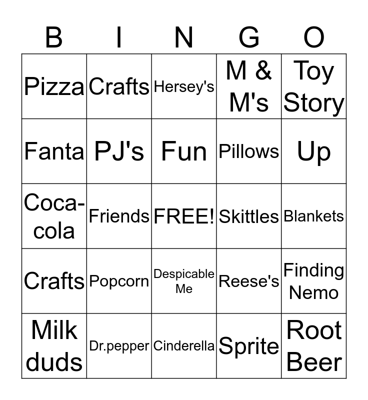 This bingo card has a free space and 24 words: Popcorn, Dr.pepper, Fun, Milk duds, Toy Story, Pizza, Fanta, Crafts, Skittles, Despicable Me, Pillows, Coca-cola, Reese's, Finding Nemo, PJ's, Sprite, Blankets, Hersey's, Up, Friends, Root Beer, Crafts, M & M's and Cinderella.