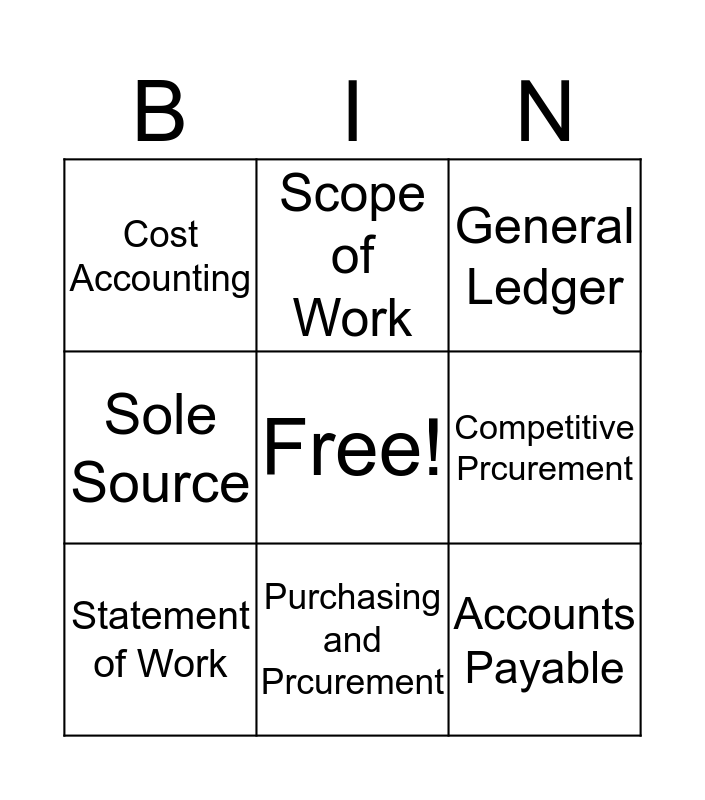 This bingo card has a free space and 8 words: Competitive Prcurement, General Ledger, Scope of Work, Statement of Work, Cost Accounting, Accounts Payable, Sole Source and Purchasing and Prcurement.