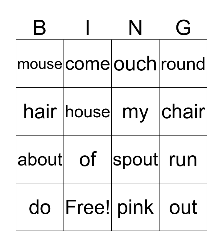 This bingo card has 22 words: Free!, want, come, some, house, my, mouse, ouch, spout, out, about, round, snout, pounce, pink, see, run, do, of, hair, chair and fair.