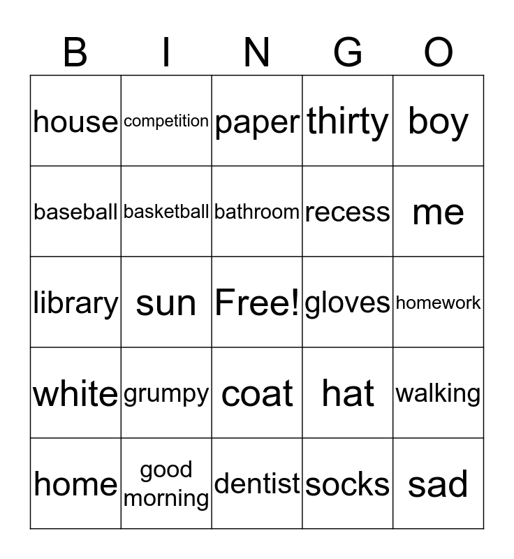 This bingo card has a free space and 24 words: grumpy, good morning, bathroom, home, boy, house, baseball, competition, gloves, coat, recess, library, hat, walking, basketball, socks, homework, paper, me, sun, sad, white, thirty and dentist.