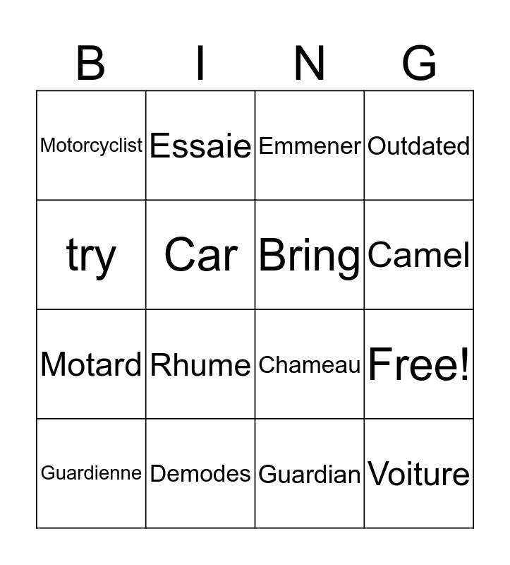 This bingo card has 16 words: Demodes, Free!, Emmener, Motorcyclist, Motard, Essaie, Chameau, Guardian, try, Car, Guardienne, Outdated, Rhume, Camel, Bring and Voiture.