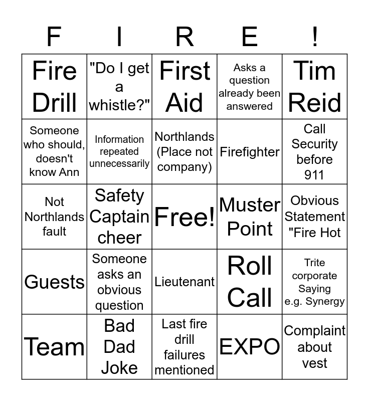 This bingo card has a free space and 24 words: Someone asks an obvious question, Bad Dad Joke, Northlands (Place not company), Team, Tim Reid, Fire Drill, Someone who should, doesn't know Ann, "Do I get a whistle?", Muster Point, Lieutenant, Firefighter, Not Northlands fault, Roll Call, Trite corporate Saying e.g. Synergy, Information repeated unnecessarily, EXPO, Obvious Statement "Fire Hot, First Aid, Call Security before 911, Safety Captain cheer, Complaint about vest, Guests, Asks a question already been answered and Last fire drill failures mentioned.