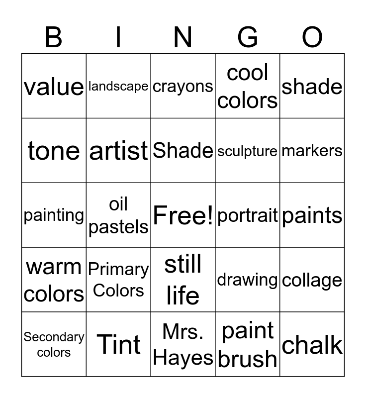 This bingo card has a free space and 24 words: Primary Colors, Tint, Shade, Secondary colors, shade, value, tone, landscape, portrait, still life, sculpture, painting, drawing, collage, artist, paint brush, paints, crayons, markers, oil pastels, chalk, warm colors, cool colors and Mrs. Hayes.