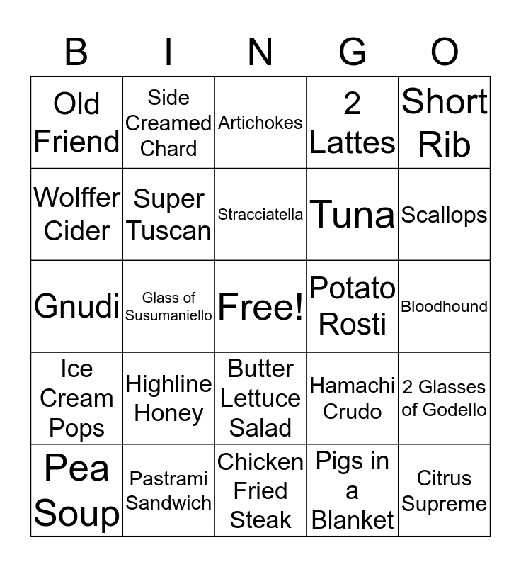 This bingo card has a free space and 24 words: Highline Honey, Pastrami Sandwich, Stracciatella, Pea Soup, Short Rib, Old Friend, Wolffer Cider, Side Creamed Chard, Potato Rosti, Butter Lettuce Salad, Tuna, Gnudi, Hamachi Crudo, 2 Glasses of Godello, Super Tuscan, Pigs in a Blanket, Bloodhound, Artichokes, Scallops, Glass of Susumaniello, Citrus Supreme, Ice Cream Pops, 2 Lattes and Chicken Fried Steak.