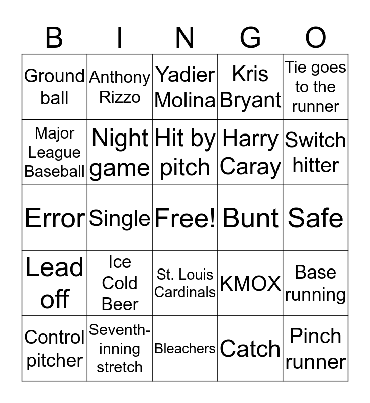 This bingo card has a free space and 24 words: Ice Cold Beer, Seventh-inning stretch, Hit by pitch, Control pitcher, Tie goes to the runner, Ground ball, Major League Baseball, Anthony Rizzo, Bunt, St. Louis Cardinals, Harry Caray, Error, KMOX, Base running, Night game, Catch, Safe, Yadier Molina, Switch hitter, Single, Pinch runner, Lead off, Kris Bryant and Bleachers.
