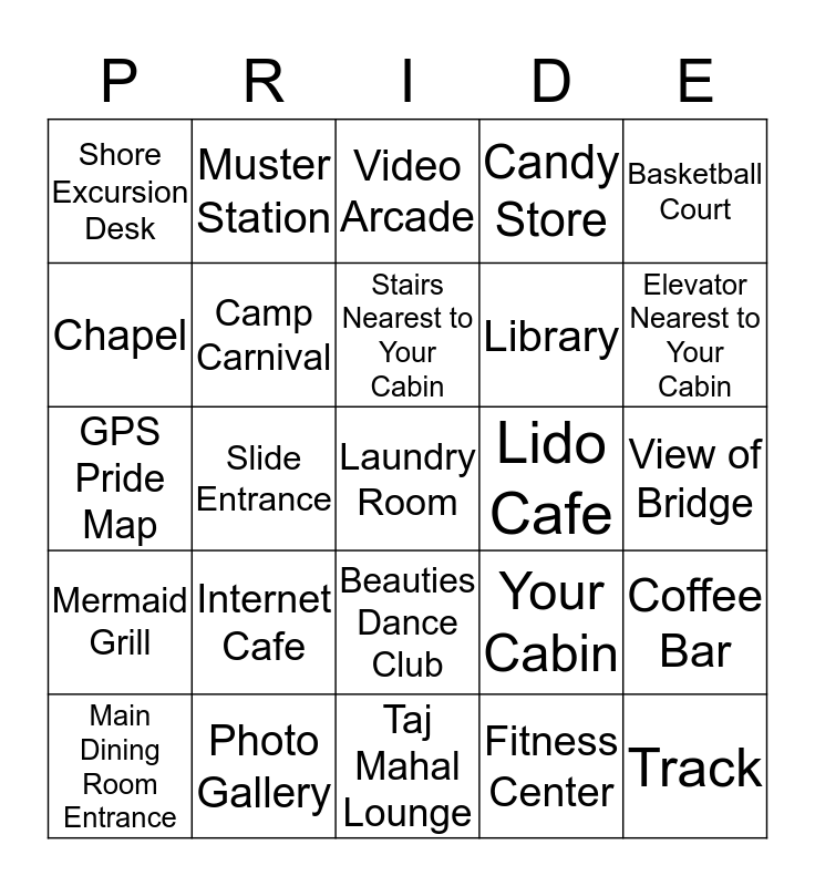 This bingo card has a free space and 24 words: Internet Cafe, Photo Gallery, Stairs Nearest to Your Cabin, Main Dining Room Entrance, Basketball Court, Shore Excursion Desk, Chapel, Muster Station, Lido Cafe, Beauties Dance Club, Library, GPS Pride Map, Your Cabin, Coffee Bar, Camp Carnival, Fitness Center, View of Bridge, Video Arcade, Elevator Nearest to Your Cabin, Slide Entrance, Track, Mermaid Grill, Candy Store and Taj Mahal Lounge.