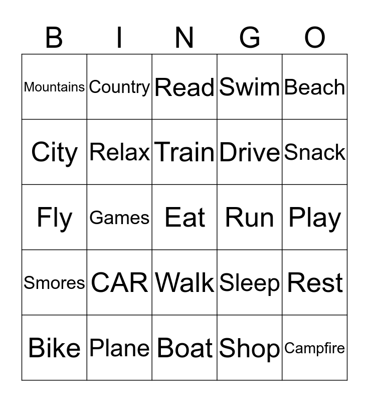 This bingo card has a free space and 24 words: CAR, Plane, Train, Bike, Beach, Mountains, City, Country, Run, Walk, Drive, Fly, Sleep, Rest, Relax, Shop, Play, Read, Snack, Games, Campfire, Smores, Swim and Boat.