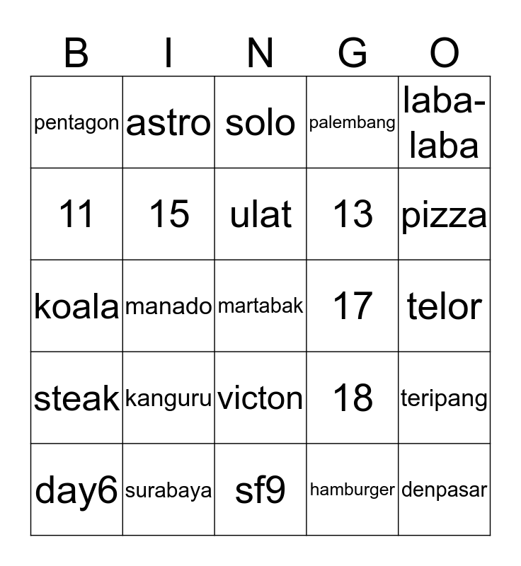 This bingo card has 25 words: kanguru, sf9, ulat, day6, laba-laba, pentagon, 11, astro, 17, victon, 13, koala, 18, teripang, 15, denpasar, telor, solo, pizza, manado, martabak, surabaya, steak, palembang and hamburger.