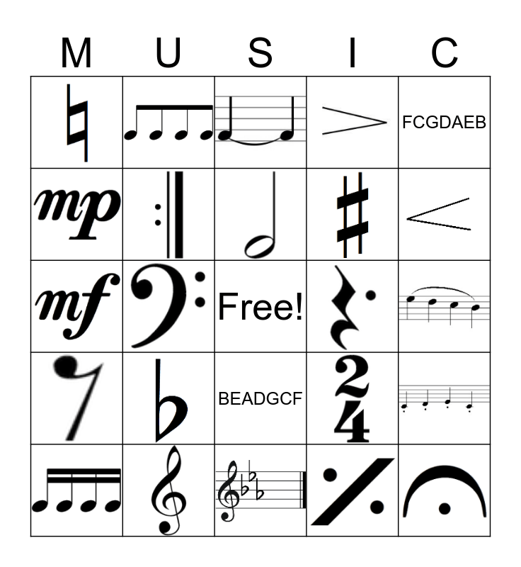 This bingo card has 22 images, a free space and 2 words: FCGDAEB and BEADGCF.