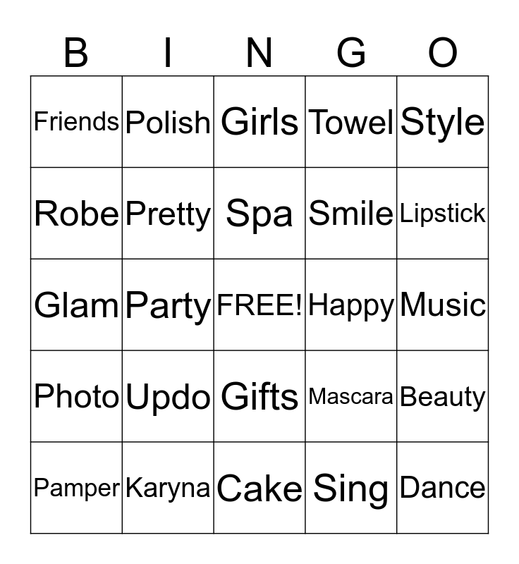 This bingo card has a free space and 30 words: Karyna, Birthday, Party, Fun, Friends, Girls, Pretty, Gifts, Happy, Cake, Music, Dance, Sing, Makeup, Lipstick, Blush, Mascara, Photo, Updo, Style, Glam, Nails, Polish, Smile, Robe, Towel, Beauty, Pamper, Spa and Makeover.