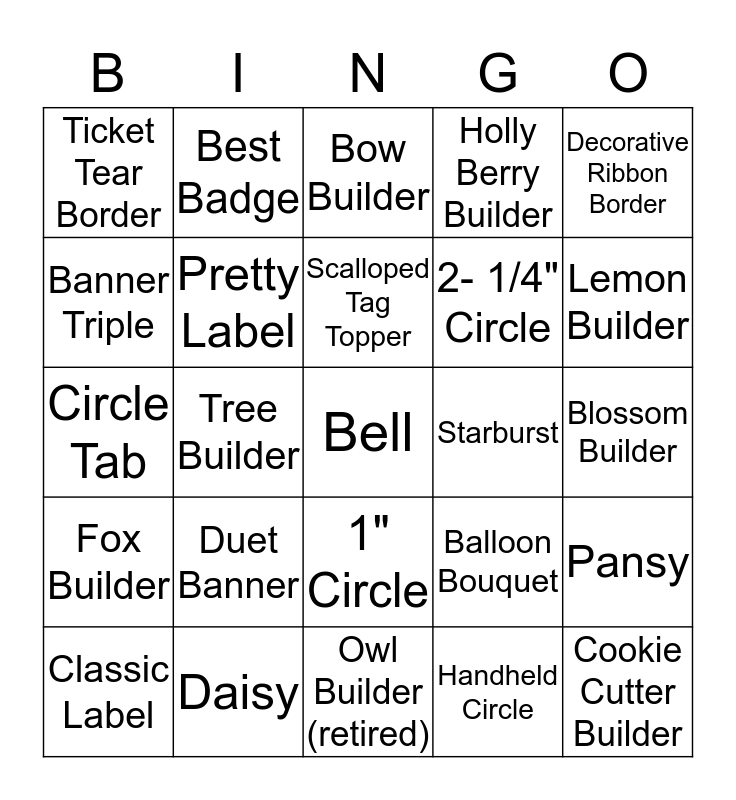 This bingo card has a free space and 24 words: Duet Banner, Daisy, Scalloped Tag Topper, Classic Label, Decorative Ribbon Border, Ticket Tear Border, Banner Triple, Best Badge, Starburst, 1" Circle, 2- 1/4" Circle, Circle Tab, Balloon Bouquet, Pansy, Pretty Label, Handheld Circle, Blossom Builder, Bow Builder, Lemon Builder, Tree Builder, Cookie Cutter Builder, Fox Builder, Holly Berry Builder and Owl Builder (retired).