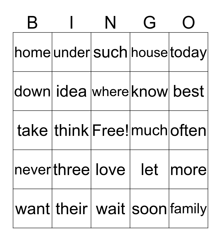 This bingo card has a free space and 24 words: three, their, where, want, today, home, down, under, much, love, know, take, let, more, idea, soon, often, such, best, think, family, never, house and wait.