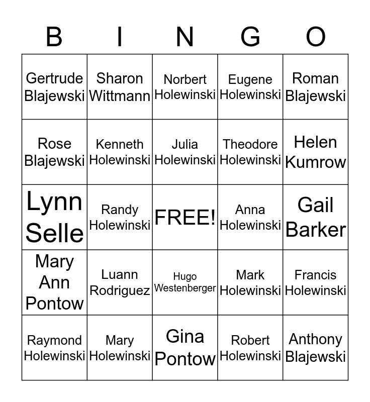 This bingo card has a free space and 60 words: Edmund Holewinski, Mary Holewinski, Rita Westenberger, Mary Ann Pontow, Robert Holewinski, Jerome Holewinski, Kenneth Holewinski, Eleanore Holewinski, Theodore Holewinski, John Holewinski, Eugene Holewinski, Frank Holewinski, Rose Blajewski, Margaret Blajewski, Victor Holewinski, Gertrude Blajewski, Anthony Blajewski, Roman Blajewski, Joseph Holewinski, Julia Holewinski, Anna Holewinski, Norbert Holewinski, Raymond Holewinski, Francis Holewinski, Judy Holewinski, Sandy Holewinski, Norman Pontow, Mary Lou Holewinski, Helen Kumrow, Jean Holewinski, Steve Holewinski, Robert Holewinski, Patty Jacob, David Holewinski, Sharon Wittmann, Terry Holewinski, Jeff Holewinski, Randy Holewinski, Loraine Stackowic, Lynn Selle, Lloyd Pontow, Luann Rodriguez, Gail Barker, Kim Thompson, Mark Holewinski, James Westenberger, Tom Westenberger, Mary Maas, Eugene Westenberger, Hugo Westenberger, Gina Pontow, Lee Selle, Lori Holewinski, Dianne Holewinski, Gary Jacob, Ted Wittmann, Paula Westenberger, Jack Maas, Georgia Westenberger and Chris Westenberger.
