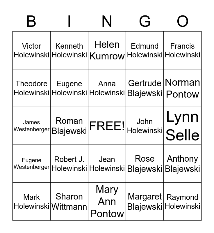This bingo card has a free space and 50 words: Frank Holewinski, Raymond Holewinski, Rita Westenberger, Mary Ann Pontow, Robert J. Holewinski, Jerome Holewinski, Kenneth Holewinski, Eleanore Holewinski, Theodore Holewinski, Norbert Holewinski, Eugene Holewinski, Edmund Holewinski, Anthony Blajewski, Rose Blajewski, Joseph Holewinski, Julia Holewinski, Anna Holewinski, John Holewinski, Mary Holewinski, Francis Holewinski, Roman Blajewski, Margaret Blajewski, Victor Holewinski, Gertrude Blajewski, Judy Holewinski, Sandy Holewinski, Norman Pontow, Mary Lou Holewinski, Helen Kumrow, Jean Holewinski, Steve Holewinski, Robert L. Holewinski, Patty Jacob, David Holewinski, Sharon Wittmann, Terry Holewinski, Jeff Holewinski, Randy Holewinski, Loraine Stackowic, Lynn Selle, Lloyd Pontow, Luann Rodriguez, Gail Barker, Kim Thompson, Mark Holewinski, James Westenberger, Tom Westenberger, Mary Maas, Eugene Westenberger and Hugo Westenberger.