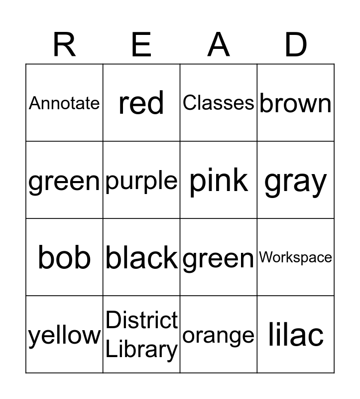 This bingo card has 16 words: District Library, Workspace, Classes, Annotate, bob, red, green, orange, green, purple, yellow, brown, black, gray, pink and lilac.