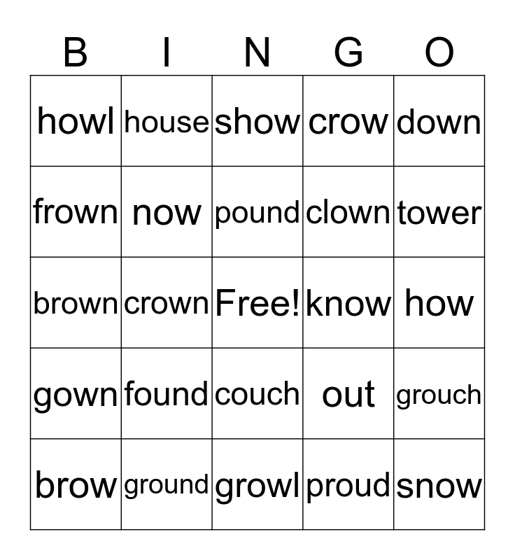 This bingo card has a free space and 24 words: found, ground, pound, brow, down, howl, frown, house, know, couch, clown, brown, out, grouch, now, proud, how, show, tower, crown, snow, gown, crow and growl.