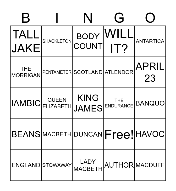 This bingo card has 25 words: MACBETH, LADY MACBETH, SCOTLAND, ENGLAND, ANTARTICA, TALL JAKE, THE MORRIGAN, SHACKLETON, THE ENDURANCE, DUNCAN, ATLENDOR, IAMBIC, Free!, HAVOC, PENTAMETER, MACDUFF, BANQUO, BODY COUNT, APRIL 23, QUEEN ELIZABETH, KING JAMES, STOWAWAY, BEANS, WILL IT? and AUTHOR.