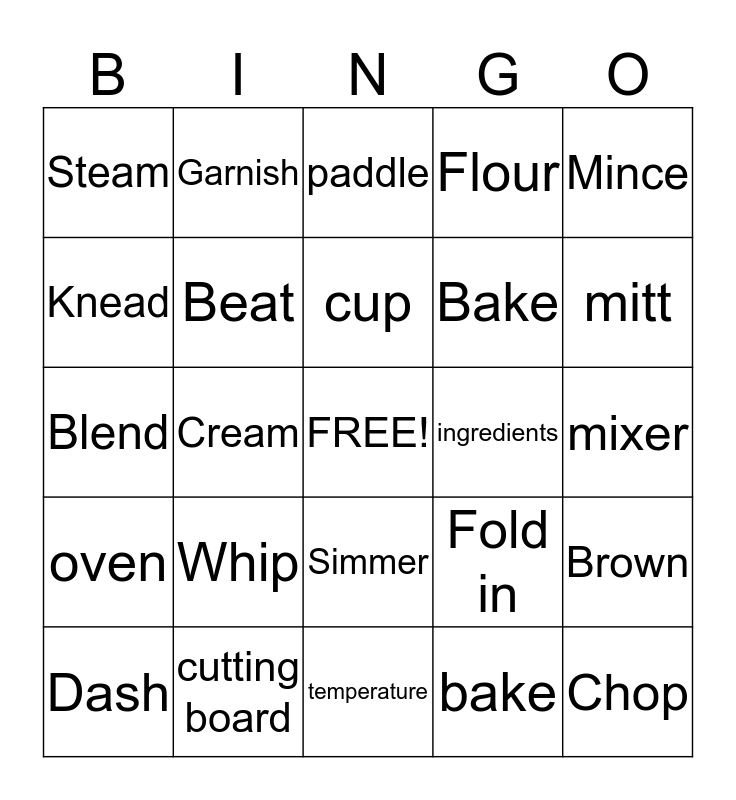 This bingo card has a free space and 24 words: Whip, cutting board, cup, Dash, Mince, Steam, Knead, Garnish, ingredients, Simmer, Bake, Blend, Fold in, Brown, Beat, bake, mixer, paddle, mitt, Cream, Chop, oven, Flour and temperature.