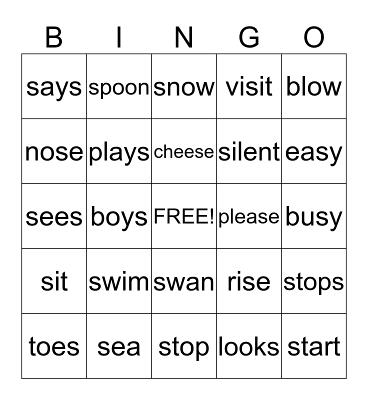 This bingo card has a free space and 24 words: swim, sea, cheese, toes, blow, says, nose, spoon, please, swan, silent, sees, rise, stops, plays, looks, busy, snow, easy, boys, start, sit, visit and stop.