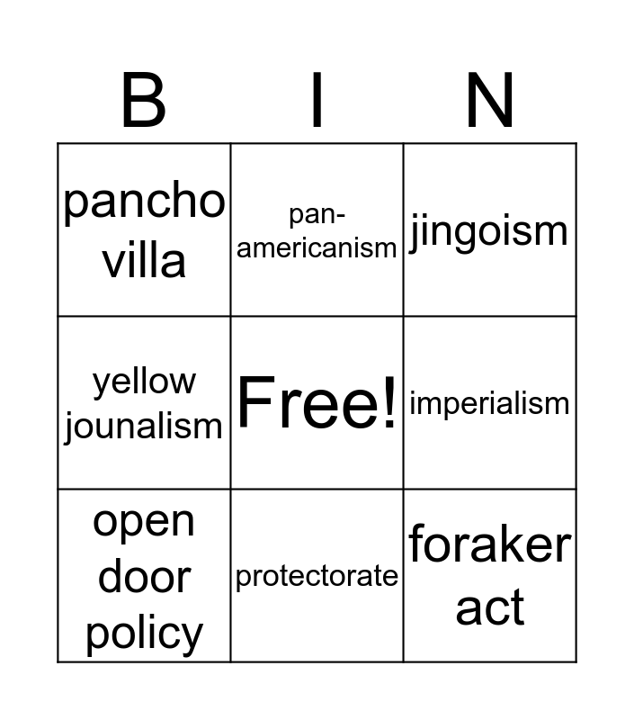 This bingo card has a free space and 8 words: imperialism, jingoism, pan-americanism, open door policy, pancho villa, foraker act, yellow jounalism and protectorate.