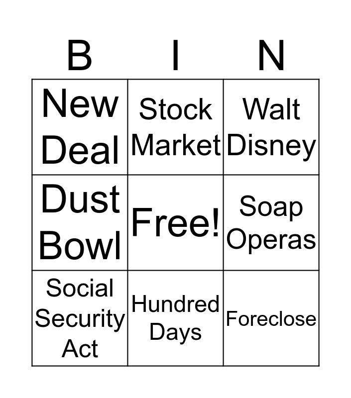 This bingo card has a free space and 8 words: Soap Operas, Walt Disney, Stock Market, Social Security Act, New Deal, Foreclose, Dust Bowl and Hundred Days.